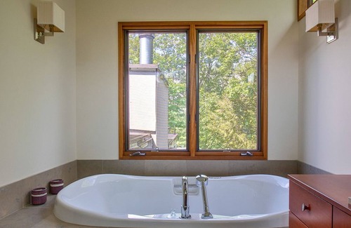 Take a few steps up to a master bedroom suite with its own gorgeous views, plus a huge private deck featuring 360-degree panoramic sightlines of the Hudson River and surrounding valley. Enjoy the large master bathroom with oversized shower and separate jacuzzi. Two walk-in closets complete the luxurious amenities of this primary bedroom sanctuary.