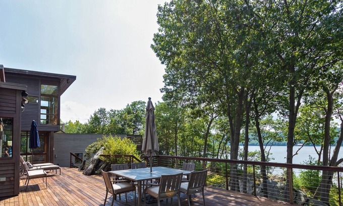 Welcome to the Poppinga Lodge…a dramatic, cozy, contemporary home, sitting among beautiful rock outcroppings on the shore of the Hudson River in Hyde Park, New York.