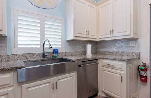In the back of the home, you’ll find an outdoor seating area perfect for relaxing in Gulf breezes, and a fully enclosed fence for those bringing their furry friends to run free.