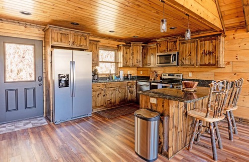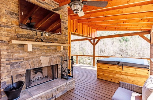 The location of this beautiful cabin gives you plenty of privacy so you can relax and enjoy the sounds of nature. Out on the wrap around deck you can enjoy the mountain views from the hot tub or gather around the outdoor fireplace! The property also includes access to your private pond with a dock! Minutes away from Lakes End Marina and Lakes End Bar and Grill. Bring the whole family to your next Smoky Mountain Getaway.