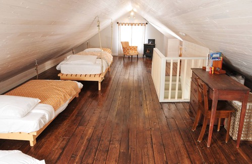 - Loft (top floor ): 1 double bed, 2 single beds. Children's playroom, dormitory and a workspace. Possible to set up 4 extra cots in the loft area