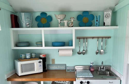 Relax and unwind in the Puffin's Nest cottage, a 1-bedroom Boothbay Harbor retreat. This beautiful cottage features a queen bed and kitchenette for your convenience. The kitchenette includes a mini fridge. Perfect for a couple's getaway. The Puffin's Nest is also convenient for a couple with a baby or toddler, as the bedroom can fit a pack-n-play next to the queen bed.