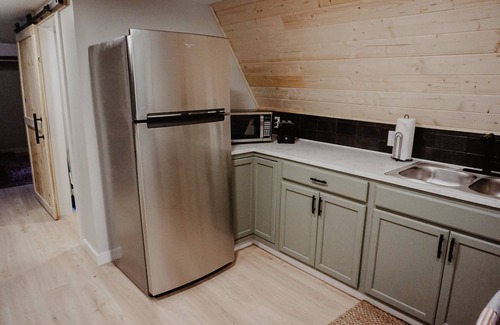 The Quail House is an A-Frame cabin with an upstairs loft, which has a queen bed. The loft also has a half bath and a record player with hand picked records straight from our personal collection for your enjoyment.