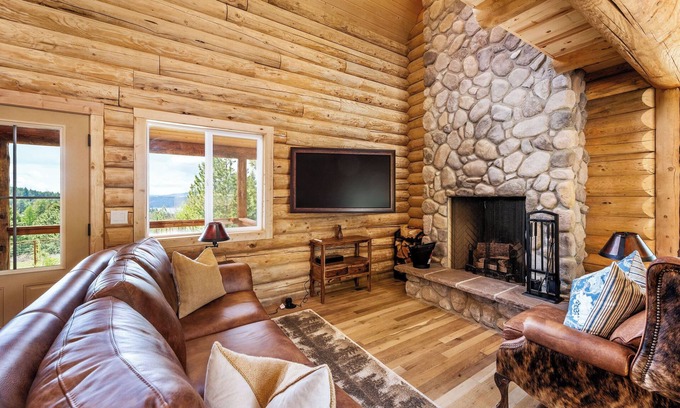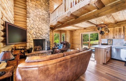 Welcome to The Ranch at Lake Coeur d'Alene! As you step through the front door of this newly built log cabin, you’ll be instantly charmed by the warm and inviting atmosphere. The entryway opens up to a spacious living area dominated by a gorgeous rock fireplace, perfect for cozying up on chilly evenings with a good book or loved ones. The rustic yet elegant decor sets the tone for a relaxing and memorable stay.