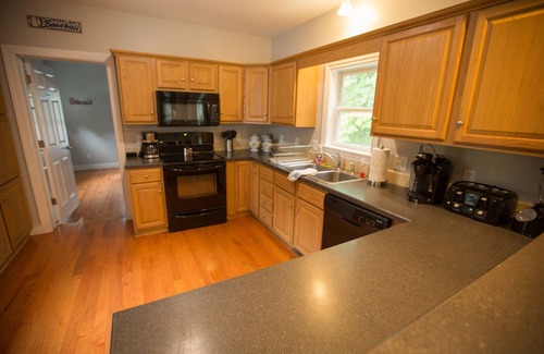 The first floor boasts an open kitchen, a dining area, and living space. The kitchen is stocked with cooking essentials - pots and pans, toaster, blender, dishes, wine glasses, etc. Just off the kitchen, the back door leads you to a quiet, a large secluded deck with comfortable seating to take in the country air. In the living room, a large flat-screen TV. With large leather sofas, there’s room for everyone. Also on the first floor are 4 bedrooms: a queen with a half-bath and private entrance, an en suite king bedroom, and queen and king rooms that share a bathroom. With TVs, and closets in every room, you will feel right at home.