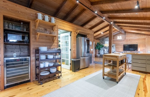Enter into the expansive center of the home, with floors and walls lined in bright cypress wood. Toward the front of the house you will find a wonderful light filled room with a gas burning fireplace, 65" smart TV,and plenty of lounge seating for relaxation and conversation. The living area opens to a fully stocked kitchen, with gas stove, modern appliances, and a wine fridge. You'll gaze out over panoramic views as you cook, then enjoy meals in the cozy dining area and separate breakfast table with seating for everyone! The dining area is flanked by a series of double sliding doors that open to let in the mountain breeze.