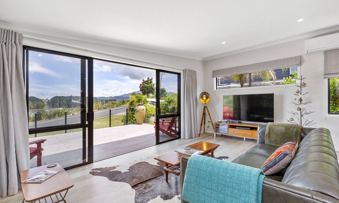 Stunning family home located on a quiet cul-de-sac street approx 1km from Raglan township. Tastefully decorated, an expansive floor plan & stunning views of the harbour and surrounding rural landscape.