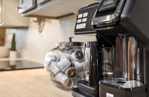 To the right of the living room, you'll see our fully-stocked kitchen. We have EVERYTHING you need to create a home-cooked meal, comforting baked good or energizing cup of coffee. Between the kitchen and living room is a large, wood-top island with two barstools. And on the left side of the kitchen, you'll see a bar with four additional barstools.