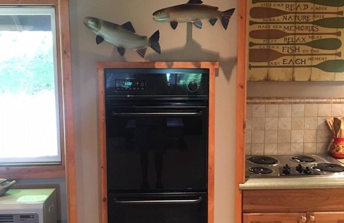 The fully stocked kitchen has been remodeled with hickory cabinets and new countertops. There is a double oven, electric range, full sized refrigerator, microwave, a Keurig coffee maker, and a regular coffee pot. There are also two outdoor charcoal grills available for use. Just bring your own food!
