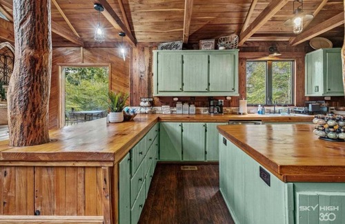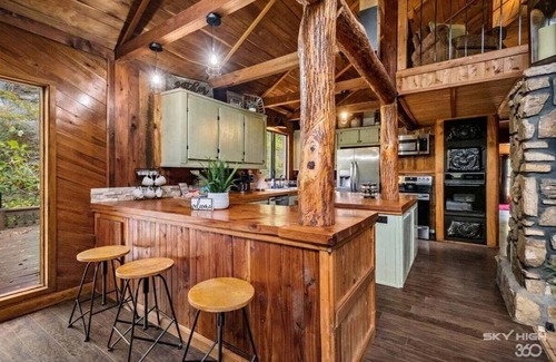 Our cabin features 6 bedrooms, 3 bathrooms, beautiful large deck, open kitchen, living, and dining area. The master bedroom has a king bed with a large bathroom. Master bath has a stackable washer and dryer as well as a beautiful walk-in shower. Second downstairs bedroom has a king bed and there is also a crib. The rest of the downstairs space has 2 more bathrooms, 1 with a walk-in shower and the second with a jet tub, another bedroom with a queen size bed, and the back room with 4 full size bunk beds. The upstairs overlooks the living room and kitchen area and also has 2 more bedrooms both with queen beds. The house has 1 tv in the living room that offers streaming only so make sure you bring your log-in info. There is a Keurig and drip coffee maker, electric skillet, stove, extra oven, dishwasher, fridge, and dining for 12. Propane grill and small propane firepit on the beautiful deck and a large fire pit in the yard.