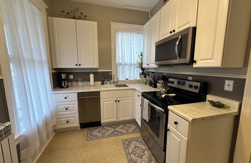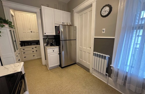 The house is an original 1910 historical mirror image duplex, intentionally built of two homes for two generations of families side by side. While you’ll be staying in the north-east home, the front entry vestibule, basement laundry area, and ½ of the back yard are shared with the mirrored home. The colonial revival has been beautifully preserved and includes many of the original details such as hand carved wood, brass & crystal light fixtures and original butlers pantry. The house is elegantly furnished, with rooms on two floors including a covered front porch, entry vestibule, beautiful staircase, parlor sitting room, formal dining room, renovated kitchen, original bathroom, 1/2 bathroom on main level, two bedrooms and enclosed rear porch. The main parlor includes an entertainment cabinet with a 43” LED TV, smart blu-ray player, Roku system and bluetooth soundbar. The master bedroom includes period furniture, a queen sized bed, 43” LED TV, smart blu-ray player, Roku system, bedside USB charging station, radio alarm clock and A/C (during summer months). The second bedroom includes period furniture, a full sized bed, 40” LED TV, smart blu-ray player, Roku system, bedside USB charging station, radio alarm clock and A/C (during summer months). The original bathroom has ceramic wall tiles and includes an antique claw foot tub. The renovated kitchen includes stainless steel appliances, refrigerator, electric stove/oven, microwave, toaster, drip coffee maker, small espresso machine and Nespresso Citiz machine (capsules not included). Washer and dryer are located in the basement. It is a short walk to the pedestrian bridge riverwalk, close to downtown, restaurants, bars, shops and movie theater. SUNY Oswego college is a 10 minute drive and public transportation is also within walking distance. Off street parking is provided and high speed Internet is included. Step back in time at the Reid-Tanner House and experience everything historic Oswego has to offer.