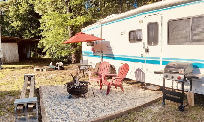 Enjoy your own little slice of heaven in this decked out 90’s style Winnebago on the farm. If you love retro, camping and animals this is the place for you. Disconnect by the fire, visit with the critters, or have a 90's movie night with your own VHS player and some of the best classics on film. Just a short drive from 95, Richmond Hill, restaurants and shopping. View the marshes at Fort McCallister State Park or take the 35 minute drive over to Savannah for a fun day trip. Pet friendly (duh!).