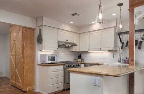 The open floorplan starts with a welcoming living area and adjoining workspace with a flat screen smart TV and highspeed internet for fast TV streaming and remote working. Floor to ceiling windows and doors overlook the lusciously green and private backyard. Enjoy your coffee or happy hour in the outdoor living space, cozy up by the wood burning fire place, or share a meal with friends and family underneath the grape vine wrapped pergola.
