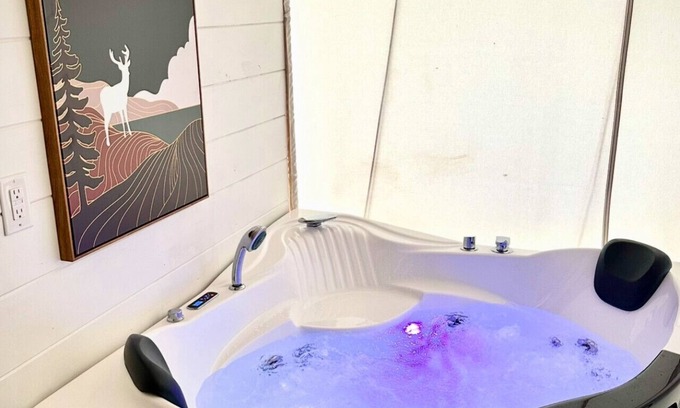 Enjoy a couple's luxury getaway in the Richbourg Safari Tent nestled within Campsite 2 at Nine Pines Retreats. Step in this fully furnished safari tent to discover a spacious retreat complete with kitchenette, heat and air, shower, toilet and all the extras. Lounge on your private deck or the overlook deck basking in the serenity of the valley of pines. Hot tub, sauna, hiking trails, outdoor dining, cooking, & more for your enjoyment. 5 min from lake access. Inquire about groups/multiple tents.
