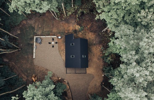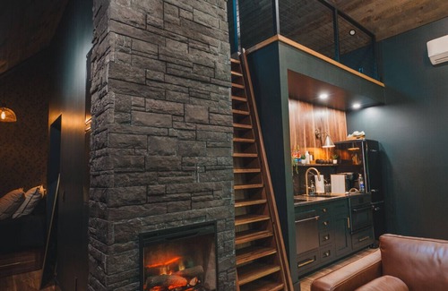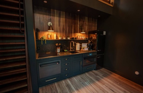 Professional photos coming soon! Welcome to The Ridge. Our newest build, a 650 sqft modern cabin crafted as a high-end hideaway tucked deep in the woods. Designed with intention, it features a vaulted 20-foot ceiling, dramatic skylights, and rustic barnwood finishes overhead. Inside, you’ll find warm, moody interiors, a floor-to-ceiling stone fireplace, heated tile floors, and custom millwork throughout.