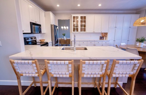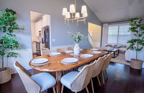 Discover your home-away-from-home in this stunning 3,700 sq ft, three-level retreat. Featuring rich dark hardwood floors, elegant plantation shutters, and newly updated with marble-quartz countertops, this property blends timeless quality with modern comfort. The fresh décor pairs neutral-modern elegance with boho-chic touches, creating a warm and stylish atmosphere for your stay.