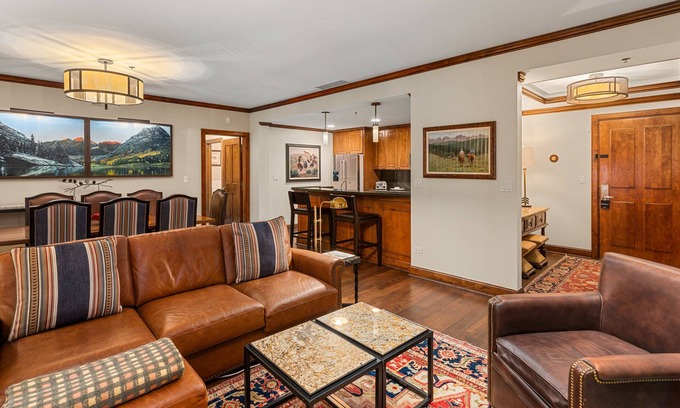 The Ritz-Carlton Club, Aspen Highlands, is a world-famous full-service resort, ideally situated at the base of the Aspen Highlands ski area with true ski-in, ski-out access, the famed Highland Bowl and just five minutes from downtown Aspen. This two-bedroom, two-bathroom Ritz-Carlton Residence lives like a luxury mountain home with a spacious living room and kitchen, ideal for entertaining. Rich leather couches, warm wood finishes, finely decorated bedrooms with Frette linens, and natural stone fireplaces (gas) bring a classic Western ambiance to life. The luxurious master bathroom has a double vanity and a heated Italian marble floor.