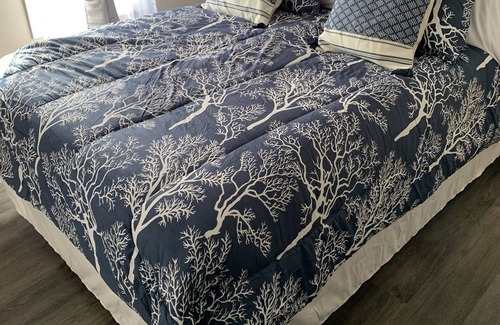 This house features a queen bed that sleeps 2, a sleeper sofa that sleeps 2, and two twin beds that sleep 1 each for a total of 6. There is a shower in the upstairs bathroom, and a bathtub shower combo in the downstairs. The kitchen has full sized appliances and is supplied with dishes, cooking and baking ware, cutlery, a Keurig, toaster, and blender.