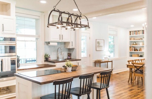 Enter through the back door to find the open-concept dining room and kitchen areas. The kitchen is fully-stocked to make large family dinners a breeze, and seats three at the eat-in island. The dining room seats eight at its antique table.