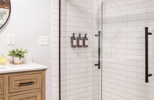 The full first-floor bathroom can be accessed through the first floor bedroom or off the kitchen. It has a large vanity, a tiled walk in shower, and a separate area with a counter and mirror, making it functional for large groups to get all dolled up at the same time.