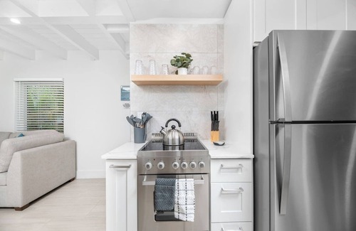 Welcome to our charming one-bedroom unit near downtown Fort Lauderdale! Enjoy private patio areas and access to a shared dockside sitting area on the New River, perfect for watching mega yachts sail by. The unit features a cozy living room, full kitchen, work space, and bathroom. Just a short walk to great food, a marketplace, and a beautiful park. Book your stay for a perfect blend of relaxation and convenience!