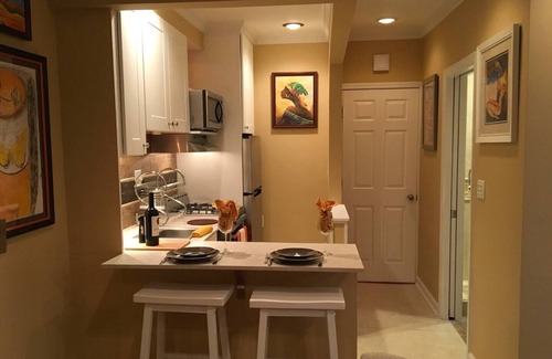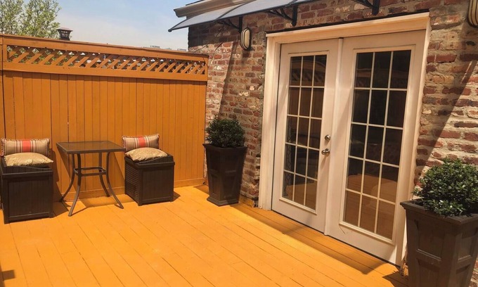 This quaint studio unit has a kitchenette and private bathroom with a walk-in shower for your convenience. The sitting area and a queen size bed is adjacent to a large private outdoor rooftop patio to take in some sun or just relax in an outdoor space. The unit is on the top level of an historic townhouse located on a quiet street in historic NJ. Just two short blocks from the train to NYC, walking distance to Washington Park, Whole Foods, Starbucks and other eateries.