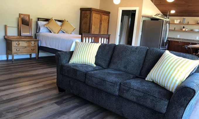 The Roost is a private studio apartment with a full kitchen and bathroom. There is a seating area with a hide-a-bed sofa, multiple eating spaces and a gorgeous view of the John Day River.