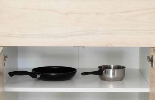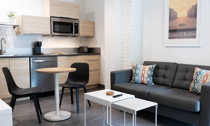 The furnished one-bedroom hotel-like apartment features a solid commercial entry door, deadbolt & security latch, laminated glass windows, and commercial grade interior fire & sound-rated separation walls. A dual tankless water heater and two mini-split head units in the living room and bedroom provide unmatched climate control. Fill the refrigerator, load the Dishwasher, make a meal in the microwave or cook a home meal on the stovetop; we provide all the essentials in the cabinets.