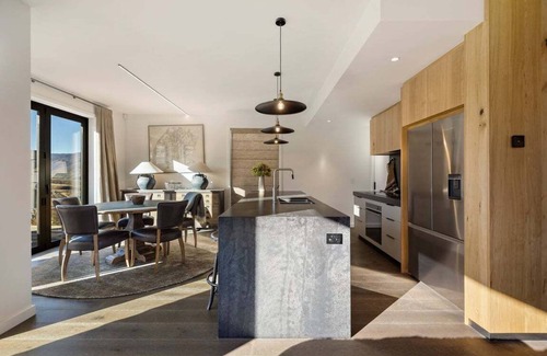 With four spacious bedrooms and three modern bathrooms, there’s plenty of room for families or groups of friends to spread out and relax. Underfloor heating keeps things toasty in cooler months, while full-height glazing throughout brings the stunning mountain surroundings into every room.
