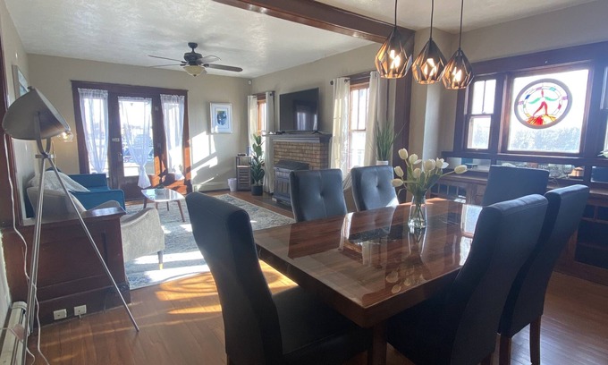 Located in the heart of downtown Alamosa, The Ross offers a newly renovated space for 8 guests with 2 Living Room areas with 55 inch TV's, formal dining area, office space, & a reading room. Lower floor offers a bedroom with pillow top king bed, a kid friendly bunk room, full bathroom, & well appointed kitchen. Upper floor includes 2 bedrooms-one full & one queen bed, bathroom with bathtub only, & reading/game room. Enjoy beautiful built-ins &original wood from this beauty built in 1908!