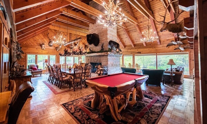 It is a late 1940s, wide-planked, knotty pine, tongue and groove Lodge built on a massive, exposed beam construction frame. The mix of wood, custom metal railings, big game mounts, and pelts lets you know you will stay in a recreational masterpiece.