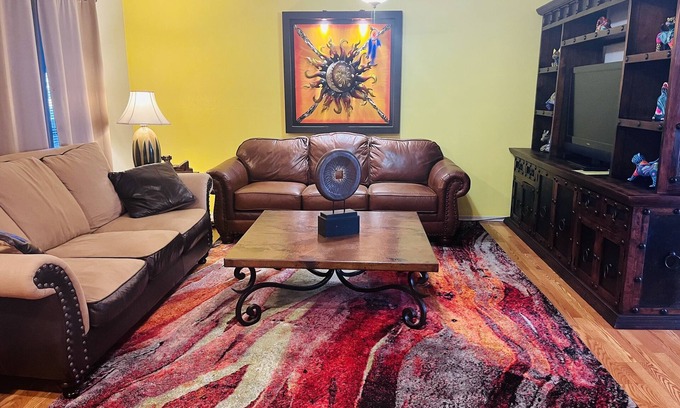 Find your home away from home in our beautiful two-story 1440 sq. ft. high end condominium furnished and decorated with one-of-a-kind Mexican Rustic Hacienda style pieces by THE RUSTIC GALLERY in San Antonio TX. Our home is fully equippped , has a private patio, large community pool and two assigned parking spaces. It is in a superb location two blocks from IH35 and Del Mar Blvd, a block from HEB, Target, Best Buy, minutes from Mall Del Norte and five minutes from Texas A&M International University (TAMIU). The condominium has a large living and dining room area, spacious master bedroom with a king size bed a large couch and en-suite master bathroomm, second bedroom has two double beds and it's own full bathroom. Kitchen is fully equipped and there's a half bathroom with a washer/dryer.