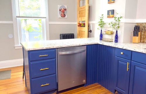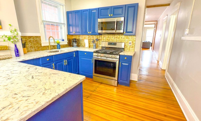 Gorgeous quartz countertops, with their subtle veining and touch of gold finish, beautifully complement the navy and gold color scheme, offering plenty of space for meal preparation. The kitchen island serves as a focal point, featuring barstool seating for three, perfect for casual dining. All essential cooking equipment, including pots, pans, and utensils is included. Should you have any specific culinary needs or requests, we'll be happy to accommodate them upon request to ensure your cooking experience is exceptional.