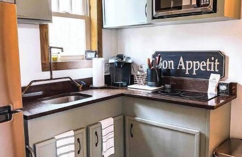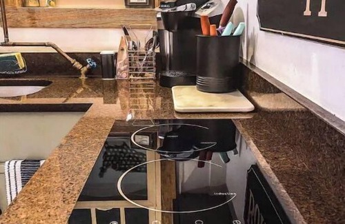 In the kitchen you’ll find your paper towels/or Kitchen towels, salt, pepper, sugar, plates, bowls, cups, silverware, pots (specific for induction cook top), coffee and kureig coffee maker, microwave along with a toaster oven which can air fry, toast , bake and and more in the labeled cabinets. The stove top is an induction cooktop and the pots provided under the stove are required for it to work efficiently and properly .(they must be on the stove top prior to turning it on for them to heat, then just turn on and use as normal). Unfortunately there is no oven , but we do also provide two grills for your convenience outdoors.