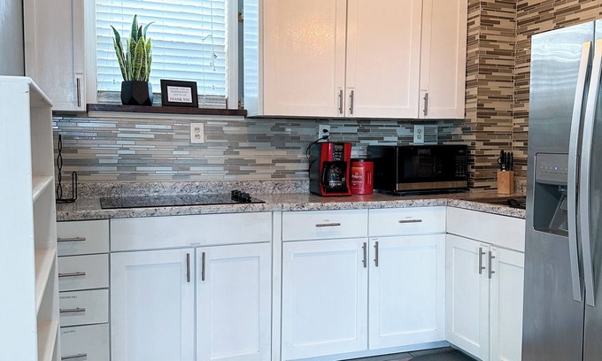 Inside you will find master bedroom with queen bed. One bathroom with wall in shower fully stocked kitchen, with stove top full size refrigerator with ice machine and a generous sized stainless sink. Coffee machine and simple breakfast supplies offered.