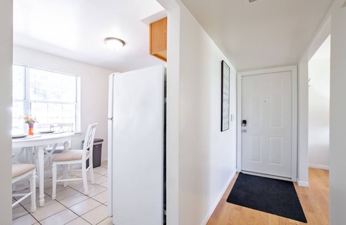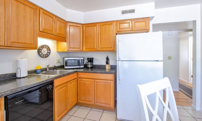 This apartment has a warm and inviting feel with natural sunlight filling every room. The living area includes a plush comfortable sofa, 50'' Roku TV paired with highspeed internet, 100mbps! The fully stocked eat-in kitchen features a charming white dining table and 4 chairs, electric stove, microwave, refrigerator and all the essentials to prepare meals. Sleep soundly in the master bedroom on a queen bed and take advantage of an extra large closet, 6 drawer dresser with mirror, lounge chair, bench and nightstand! If you are working remotely, our second bedroom comes complete with a desk and leather chair, also features two twin size beds, an extra large closet, dresser and mirror. Wash the day away in our bathroom featuring a bathtub and shower combination and is conveniently located directly between both bedrooms. Washing laundry is made possible in the common area with a coin operated washer and dryer that is steps away from your front door. Enjoy private parking on a paved lot. Sorry, Pets are NOT allowed but check out our other properties that are pet friendly.