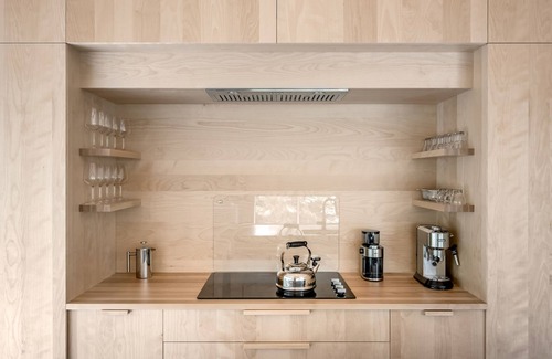 The Serene is perfect for a couple; this chalet with wooden walls and ceilings is warm and intimate. The open living area on the ground floor facilitates dialogue between the interior and exterior.