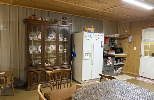 Enjoy the lovely unique and private setting that provides large space for guests. King size bed, day bed with pullout, couch, blow up queen size mattress if needed and a “pack and play” for the babies. Stove, refrigerator, microwave and bathroom with shower. Conveniently located off I-65, exit 58. Minutes from down town Horse Cave and 11 miles from Mammoth Cave. Enjoy the grill, fire pit, corn hole boards, and picnic table outside or the pool table, board games, and basketball shoot off inside.