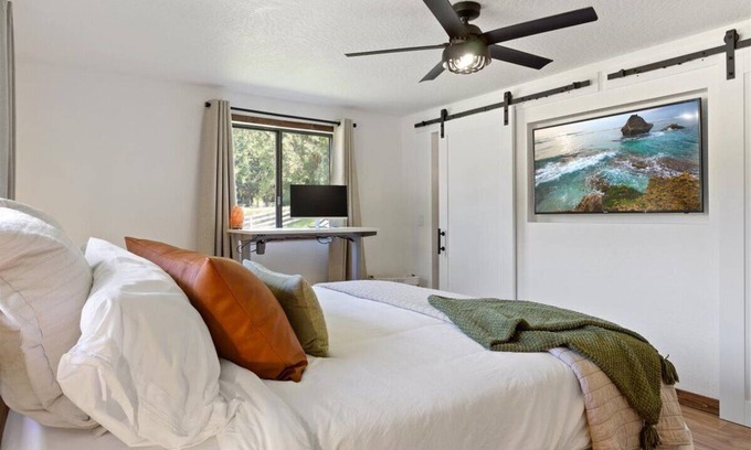 Relax and Unwind at this peaceful retreat. Near the Rogue River & Crater Lake National Park, this beautiful property is over an acre w/ lush green grass all around. Updated home w/ upscale features. Notable primary bedroom & bathroom. Both rooms have an attached bathroom, walk in closet, & work spaces. Home has excellent wifi ~ 200mbps. Many wildlife visitors roam through the property - enjoy the deer, turkeys and the birds chirping outside. Outdoor oasis with comfy patio seating and outdoor dining area, backyard lights, fire pit, BBQ, and yard games. Close to TONS of outdoor fun!