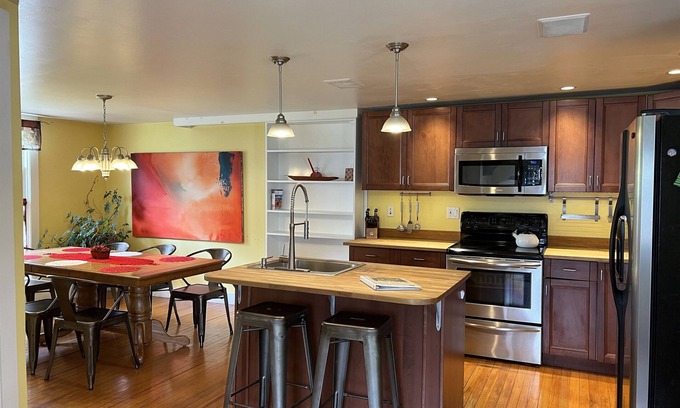 Modern conveniences and contemporary décor blend well with the features of the early architecture. One of the bathrooms retains an original claw footed tub as well as a shower. The modern kitchen with custom built cabinetry is complete with an island and a spacious dining area that enjoys a view of the backyard. Your host provides 3 TVs. This home features a living room and another room - set up to view movies or videos of your game.