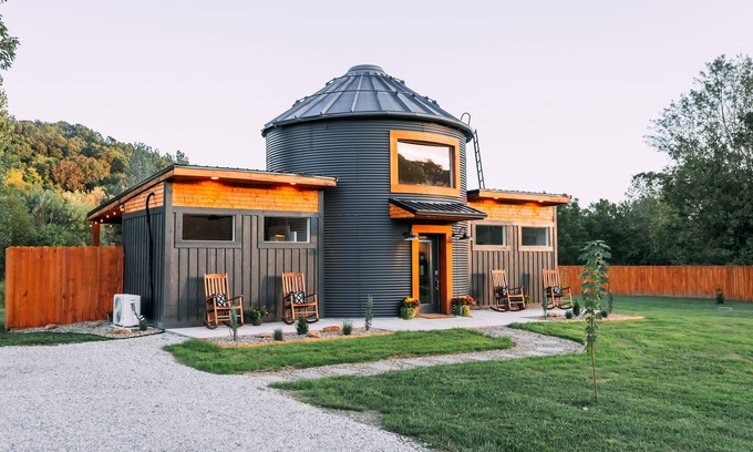 This memorable place is anything but ordinary. We can’t wait to host you in our Grain Bin/Silo vacation rental! It’s the first in the Hocking Hills region! The 25 ft ceilings make this rather tiny house feel so large! It’s definitely made for two in this cozy getaway! Our cottage offers an induction cooktop, microwave/oven/air fryer combo, gas grill(propane provided), refrigerator with freezer, Roku Tv, fireplace, great internet, comfortable patio furniture and a generous Master Spa Hot tub!