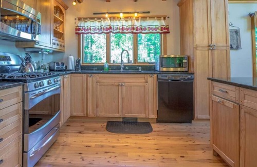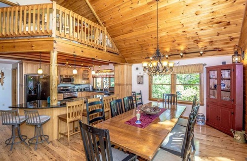 On the main level sits, 2 bedrooms, one with a king bed and 1 with a full bed. Also on the main level is our gourmet kitchen (fully stocked) with an island (seats 4), granite countertops, and stainless steel appliances. The dining room features a large table (seats 10) for family gatherings. You will love our great room's 20+ ft cathedral pine ceiling, Australian cypress hard wood floors, & grand field stone fire place. The room is filled with natural light from 4 french sliding doors and an A frame window set. There is a 75 ft wrap-around partially-covered porch that provides great mountain views.