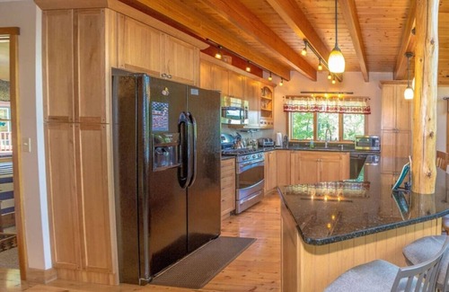 'The Hive' Luxury Mountain Log Home is a spectacular window-filled, spacious, log home offering an abundance of outdoor amenities! Our 3,000 sq. ft. modern log home has 5 bedrooms (sleeps 18) & 3 bathrooms. 300 yds away sits the 11 mile long Moose Pond, where you can hear the cry of the loons nightly, along with a barred owl or two. There is cable TV and Wi-Fi providing a first class Log home experience for multiple families. Our log home has been featured on the TV station WPXT on their 'Buy Local' Show & has been displayed on The Maine Cedar Log Home website.