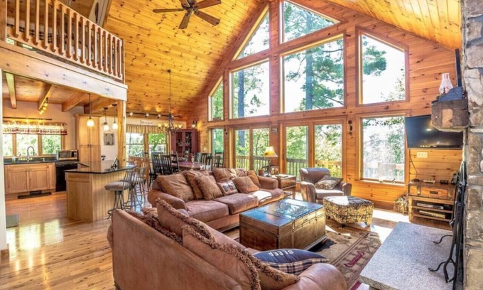 Our gorgeous wooden staircase brings you to the quaint loft where you can escape into a good book, surf the web at the office desk, or sip wine at your custom made log cocktail table. Our new leather couch also easily folds out into a nice sized full bed for extra sleeping space. The large master bedroom with a custom-made king log bed and master bath is to the rear of the loft.