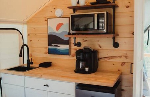 The Skinner safari tent is located inside Campsite 2. Each campsite has 4 tents. The Skinner is one or our luxury jacuzzi tub units. Campsite 2 includes a firepit with 12 Adirondack chairs, private covered pavilion with dining table, outdoor sofa and chairs, gas grill, pizza oven, and blackstone and water spigot. There is a hot tub and sauna and corn hole for your use as well as parking. A large cooler is provided at your tent to use. There is wifi and a tv in each tent as well as a drip/keurig coffee maker with complimentary coffee pods. The kitchenette consists of mini fridge, sink, and microwave. Basic, plates, bowls, cups, flatware and wine glasses provided. Linens and bath towels are provided.