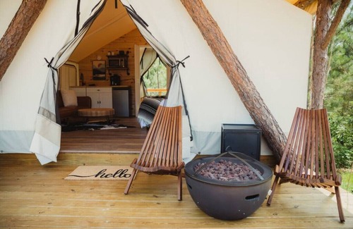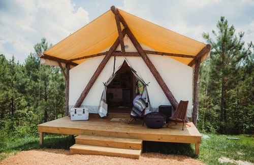 Enjoy a couple's luxury getaway in the deluxe Skinner Safari Tent nestled within campsite 2 at Nine Pines Retreats. Step inside this fully furnished safari tent to discover a spacious retreat complete with kitchenette, heat and air, shower, toilet and the luxury jacuzzi tub. Lounge on the overlook deck basking in the serenity of the valley of pines. Hot tub, sauna, hiking trails, outdoor dining, cooking, & more for your enjoyment. 4 min from lake access. Inquire about groups or multiple tents.