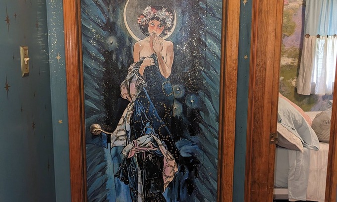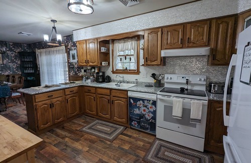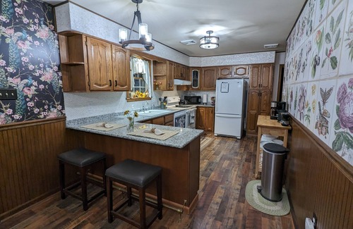 This newly renovated, ranch style home, sits on a corner acre lot just across the road from many, many acres of unspoiled, all natural, wild land owned by The Nature Conservancy .... So you have ALLLLL the wildlife just outside your front door. Ideally located in the heart of the Poconos just 5 miles from the historic town of Jim Thorpe. Less than 1 mile from the built to rock music venue of Penn's Peak. Less than 5 miles from the Butterfly Farm and the Pocono Whitewater Rafting office. Just at 9 miles to that wonderful beach at Mauch Chunk Lake and just a tad over 6 miles to the beautiful Glen Onoko State Park. It's a hop-an-a-skip of 16 miles to the Pocono Raceway and Pocono Outdoor Adventure Tours. And the surround area offers sooooo much more outdoor activity, way too much to list on here. The house is fully wheelchair accessible with a ramp and open floor plan for easy getting around the home. The kitchen is fully equipped with all the amenities you could want to create and serve fine meals for up to 12 ppl. Appliances include an electric 4 burner range with quick boil burners, a dishwasher, a double deep cast iron sink with goose neck spout, a microwave, hand mixer, blender, coffee maker, electric kettle, pour over coffee pot, a large and a small french press, a hand grind coffee grinder, a xl salad spinner, pots/pans, mixing bowls, measuring spoons/cups, baking dishes/pans, roasting pans, silverware and Corelle dishes service for 12 including pasta bowls, ample stemware for wine/cocktails, as well as some shatterproof drinking cups, coffee mugs, specialty sectioned plates, and much much more. *Note; we do not supply an air fryer as they are too difficult to keep clean. The dining room table is hand made, oversized and can easily seat 10 ppl with seating provided for up to 12. The house is full of murals and art to delight the senses and spark your curiosity. The living room is a loungers delight with two overstuffed swivel recliners, a 14 foot double~chaise 'oh-so-nappable' couch as well as two bucket style reading chairs ample floor space for games or whatnot as well as a 65" Google Smart TV with wireless high speed internet to accommodate all electronic items and entertainment. There are 2 bathrooms, first one is a walk in shower 'jack and jill' that connects the main house and the 'Van Gogh bedroom' where there is a starry night mural as well as starry night black out curtians in the bedroom that has 2 full beds with 2 twin over bunks, each with a set of stairs up to the bunk as well as a tucked away twin trundle bed. The second full bath is in the 'Monet bedroom' where there is a mural of one of his famous water lilies painting as well as other Monet prints ... this is a full attached bath complete with a 19' deep soaking tub *Note, the home is equipped with an on demand endless hot water system so multiple back to back showers are never a problem. The Monet room has a queen bed a sitting area as well and a tucked away twin trundle. Both bedrooms have privacy blinds and full drapery as well as a dresser. The home has a book case with board games, light reading, puzzles and whatnot. This home got its name "Pinkies Starlight Chateau" because of the gorgeous view of the stars at night.. With absolutely zero light pollution to dim out the lessers, the sky is just a beautiful blanket of sparkling wonder on clear nights .... The home has 2 outdoor seating areas, the front covered porch has *seasonal* rocking chairs and the back, uncovered deck is absolutely perfect for watching a meteor shower or grilling those summertime burgers. This is a VERY quiet neighborhood and we all wish to keep it that way so I please request that all outdoor activity be kept at a minimum and/or whisper quiet after 9 pm. *Note, human noise scares away the wildlife/birds that we love so much. thank you