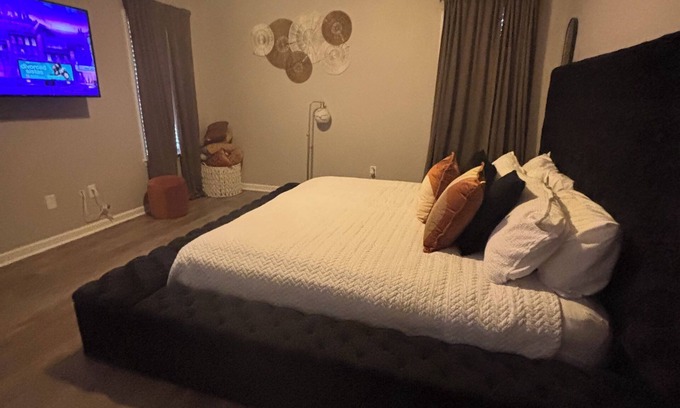 Relax in this stylish Horn Lake home just 10 mins from Tanger Outlets & 30 mins from downtown Memphis. Features a spa-style master bath with Jacuzzi tub, cozy movie room with fresh popcorn, queen bunk beds, Open bar, a big backyard deck with grill, and plenty of parking. Perfect for families, groups, or a peaceful getaway!