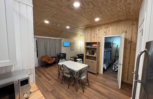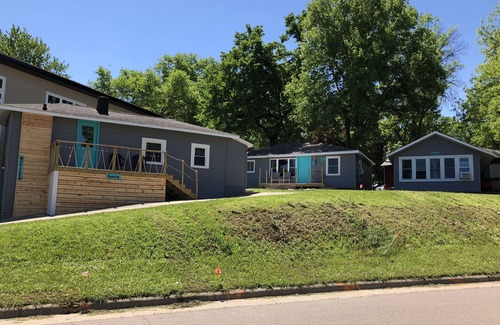 Beautiful views of West Lake Okoboji! The Stella Cottage is a 2 bedroom, 1 bathroom cottage located in the heart of Okoboji. 5 minutes to the public beach, The Emporium, The Green Space, Arnolds Park, and downtown bars and restaurants. Bedroom one has one queen bed, bedroom two has one queen bed and set of twin bunkbeds. The living room has dining table, a large sectional couch, leather chair and tv and a roll away twin bed. The cottage has A/C in all bedrooms. The cottage also has a kitchen with full size fridge, two burner hot plate, microwave, griddle, toaster, outdoor gas grill, coffee maker, pots and pans and dishes/utensils, paper towels, garbage bags, dish soap and dish rags all provided. Shower towels and linens are also provided. Large deck with chairs overlooking West Lake. Bathroom with toilet, sink, shower, and mirror. We are located in all the action just across the street from public dock access to West Lake Okoboji and fun things to do all within walking distance.