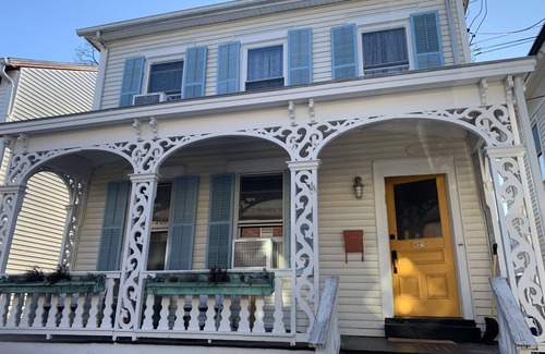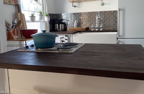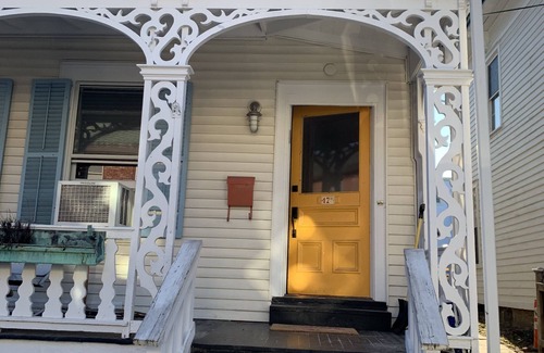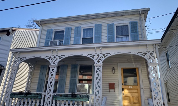 Separate apartment in the hip part of Kingston . Newly decorated 2 bedroom apartment in a historic house . The apartment t blends modern and vintage charm . New kitchen with all the amenities to cook a gourmet meal or if you prefer it is within walking distance of some great restaurants . Claw foot tub to relax in and 2 lovely bedrooms . A living dining space is bright and sunny and is decorated with great detail .Kingston is rapidly becoming the hip section of ulster county and this properties is near the water , art galleries , shops and great places to eat . You will not be bored exploring this vibrant part of Kingston . It is a perfect blend of urban and upstate charm . There is a backyard hot tub which can be used by guests all year round . Pets are welcome , just please let us know you are bringing your 4 legged family members when you book .